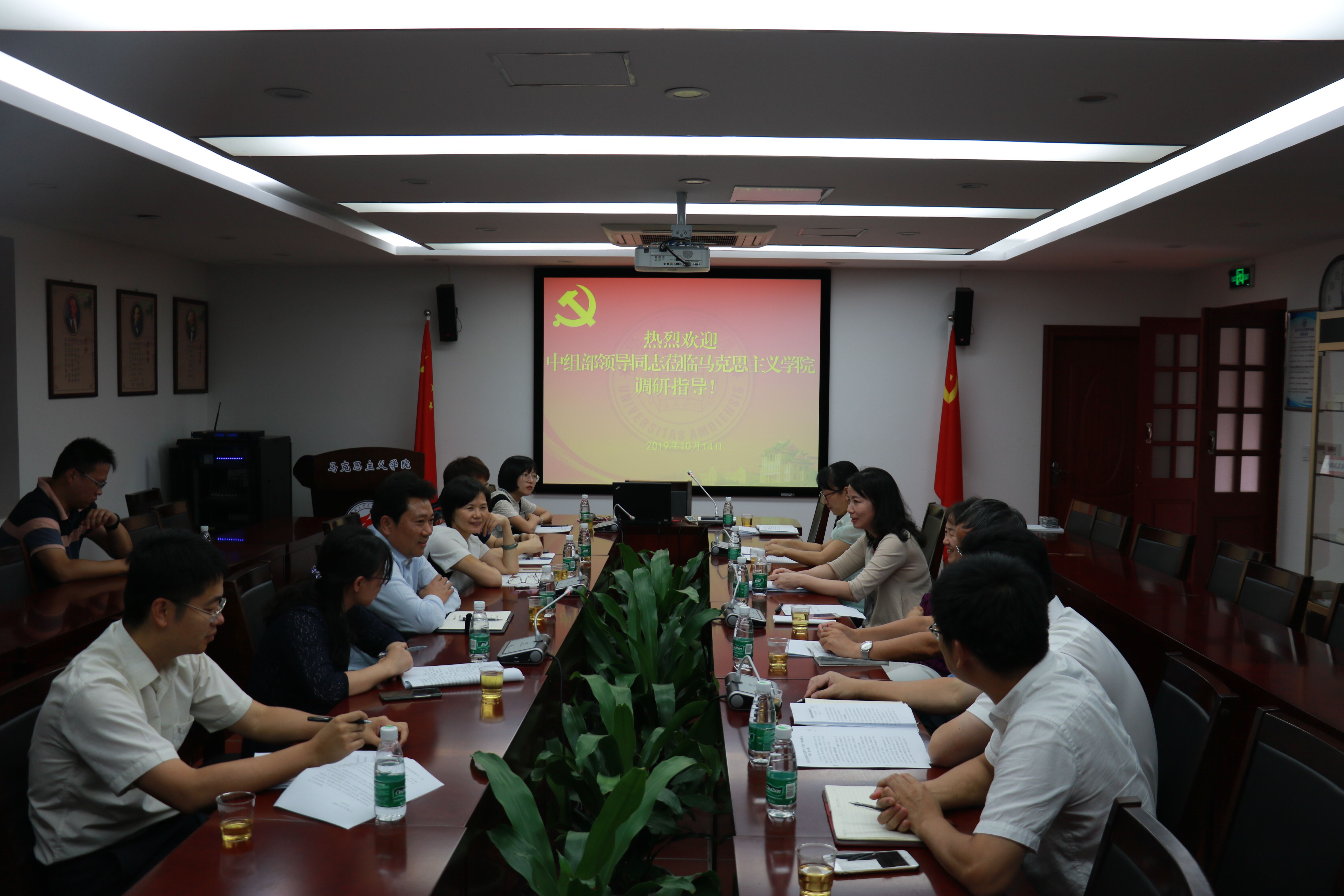 10月14日下午,中组部组织二局二级巡视员崔亚飞一行来校调研高校党建工作重点任务落实情况以及“不忘初心、牢记使命”主题教育进展情况,到马克思主义学院进行实地调研,并与学院党委领导班子、党支部书记代表座谈交流。福建省委组织部部务会成员、省委非公企业和社会组织工委专职副书记孙智英,厦门市委组织部副部长、市委非公企业和社会组织工委书记曾丽娟,校党委常委、组织部部长、统战部部长孙理等陪同调研。