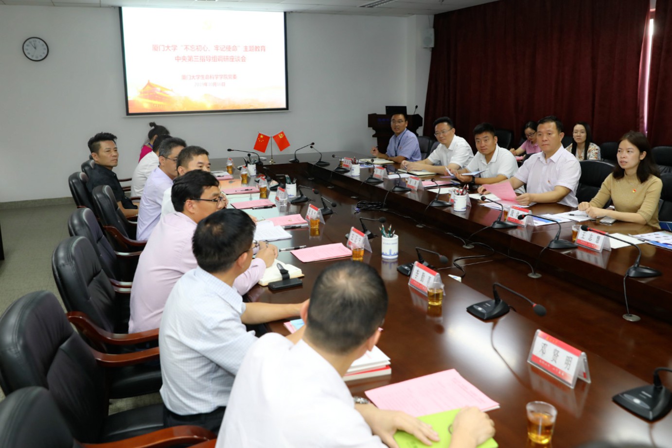 10月16日上午,“不忘初心、牢记使命”主题教育中央第三指导组成员李涛、段洪波、宋翔、王志慧等4位同志莅临生命科学学院调研指导工作。校党委常委、组织部部长、统战部部长孙理,校党建办主任、组织部副部长、教师工作部副部长廖志丹,翔安校区办公室主任兼学校办公室副主任崔庆炜陪同调研。生命科学学院党委书记张明智,副书记、院长周大旺等领导班子全体成员及师生代表参加了调研会。