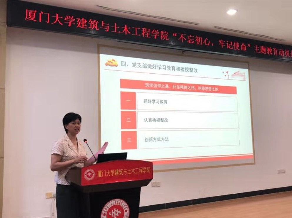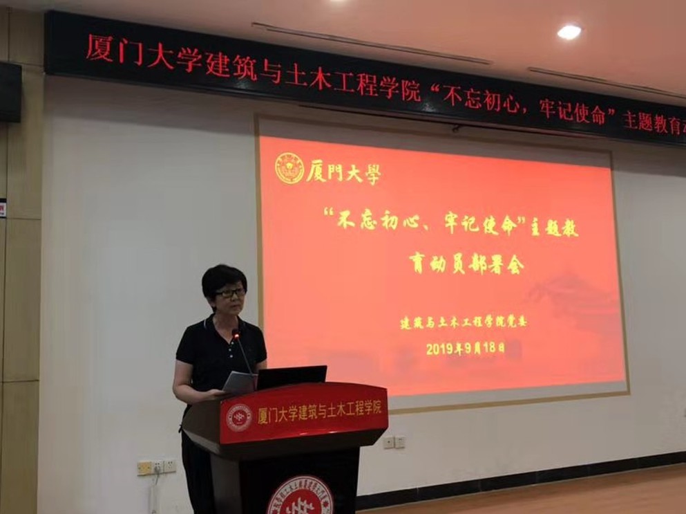 首先,由建筑与土木工程学院党委书记刘梅作“不忘初心、牢记使命”主题教育动员报告。她强调,教育是国之大计、党之大计,特别是高等教育决定着国家的科技发展水平与创新能力。厦门大学是高等教育“国家队”一员,肩负着为党育人、为国育才的时代责任和历史使命。开展“不忘初心、牢记使命”主题教育,对学院党委深入学习贯彻习近平新时代中国特色社会主义思想,落实立德树人的根本任务,健全全员全过程全方位育人的体制机制,坚定不移为全面实现厦门大学"两个百年"战略目标、加快建设中国特色世界一流大学,为全面推动学院事业高质量发展,加快学院“双一流”建设,具有重大意义。