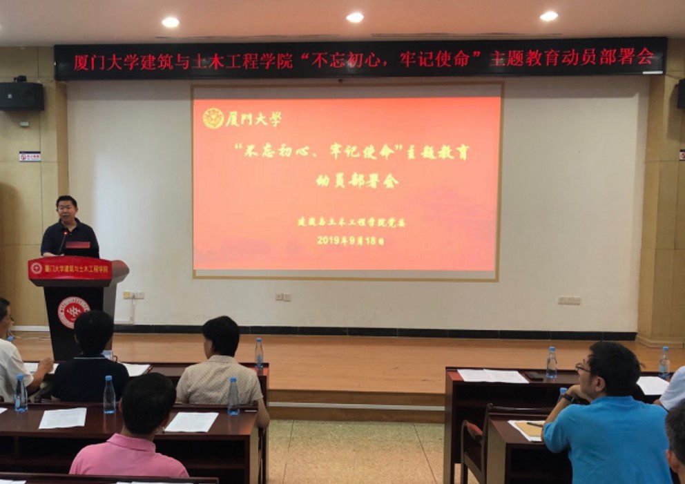 2019年9月18日下午,厦门大学建筑与土木工程学院“不忘初心、牢记使命”主题教育动员部署会在曾呈奎楼118报告厅举行。校“不忘初心、牢记使命”主题教育第二巡回指导组副组长、校党委宣传部副部长楼红英,校基层党建工作联络员黄定基,学院全体院领导,党委委员,特邀党建组织员,工青妇负责人,学工组全体成员,全体党支部书记、支部参加了此次会议。会议由学院党委副书记、院长王绍森主持。