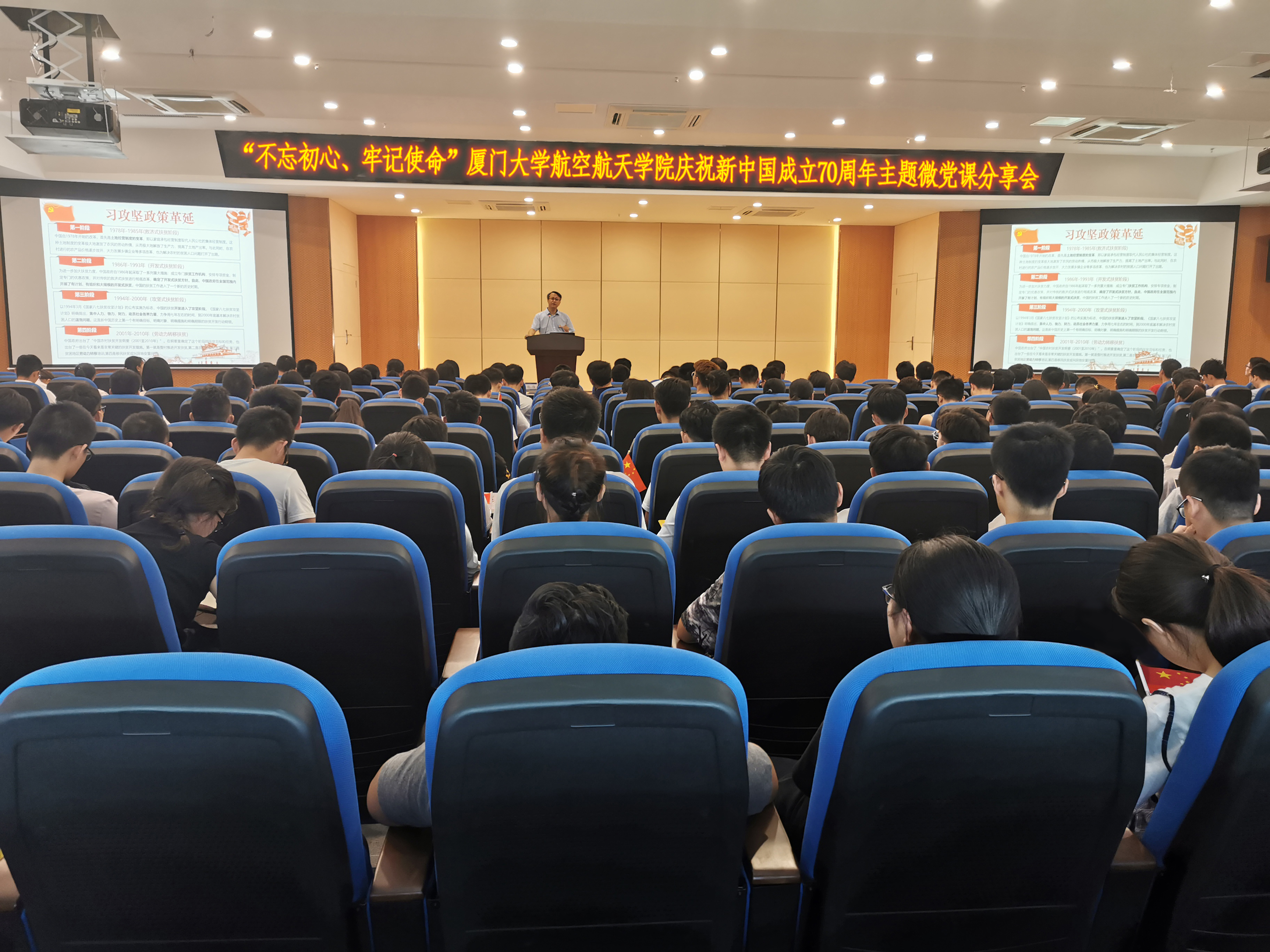 9月30日下午,“不忘初心、牢记使命”厦门大学航空航天学院庆祝新中国成立70周年主题微党课分享会在学院报告厅举行。本次活动旨在贯彻“不忘初心、牢记使命”主题教育精神,依托微型党课这一创新的党员教育载体,以简短生动的事例和个人体悟的分享,引发思考,激发党员的主动性和创造性,实现以小见大、见微知著的自我教育和相互教育的目的,为新中国70华诞献礼。