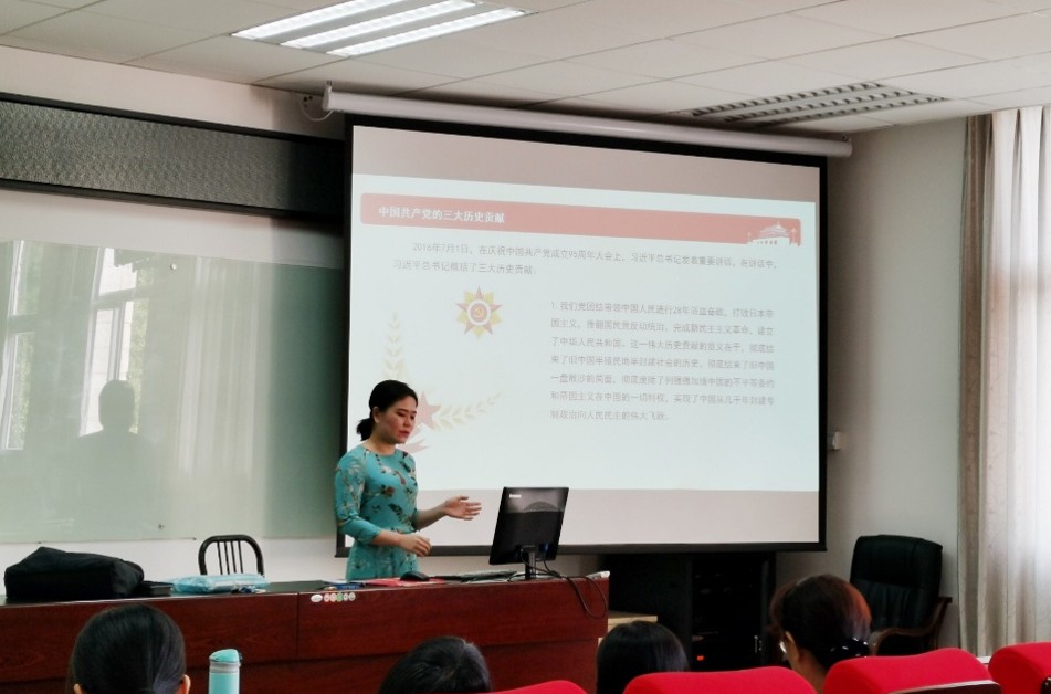 活动开始,支部书记方芳带领全体党员重温中国共产党的三大历史贡献:完成了反帝反封建反官僚资本主义的任务,结束了半殖民地半封建社会的历史;消灭了剥削制度和剥削阶级,确立了社会主义制度;开创了建设有中国特色社会主义道路,逐步迈向社会主义现代化。然后,方芳同志将理论联系实际,围绕“不忘初心、牢记使命”的精神实质,结合大学教师的初心和使命,对如何把爱国奋斗精神与具体教学工作相结合进行了深入浅出的讲评。