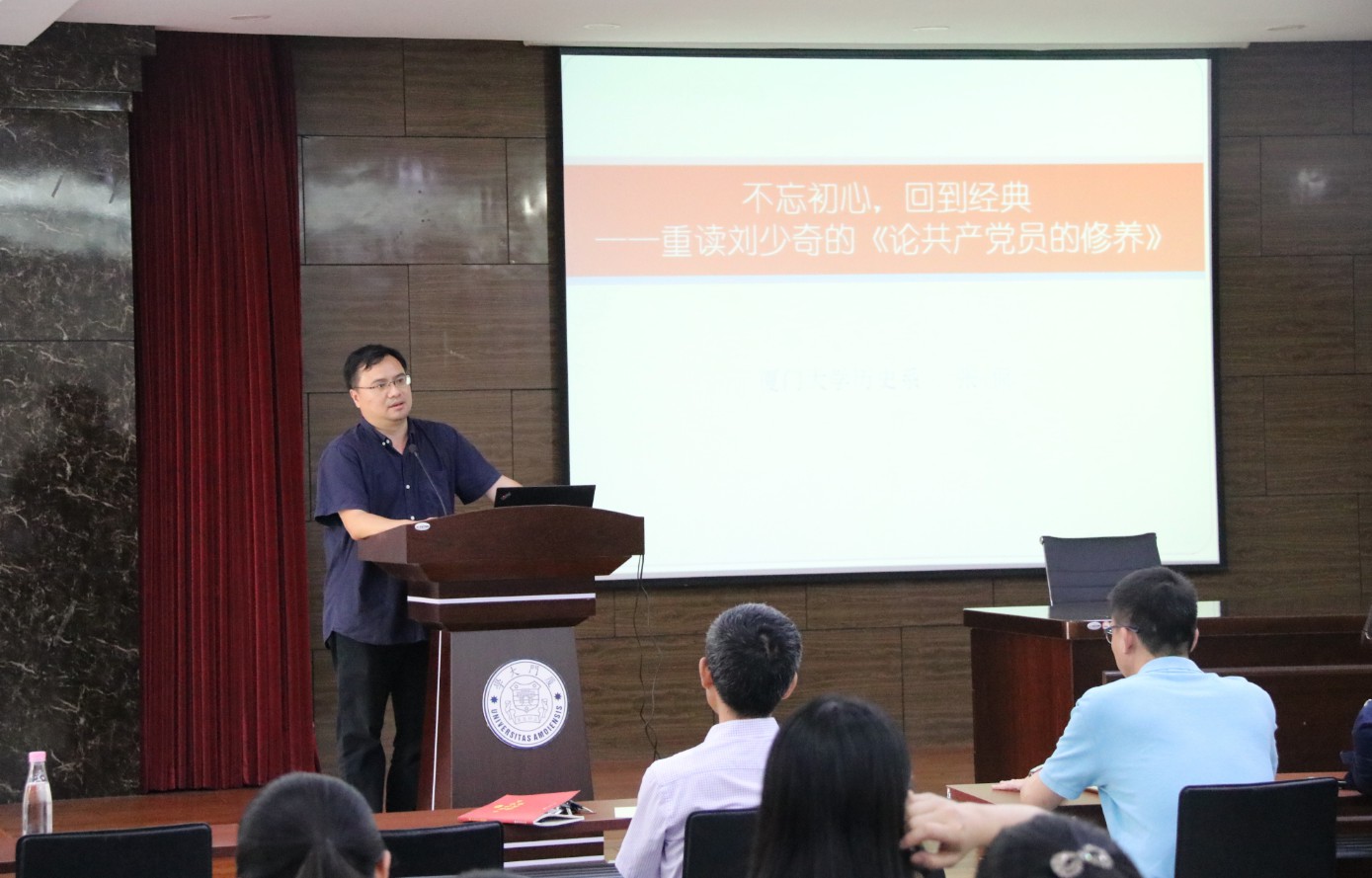 为扎实推进“不忘初心、牢记使命”主题教育,10月10日上午,人文学院“不忘初心,牢记使命”主题教育专题讲座在联兴楼多功能厅举办。厦门大学党委宣传部理论报告员、人文学院历史系主任张侃教授作了题为“不忘初心,回到经典——重读刘少奇《论共产党员的修养》”的专题讲座。人文学院党委委员,全体教职工和学生代表共200多名师生参加讲座,讲座由王日根教授全程主持。
