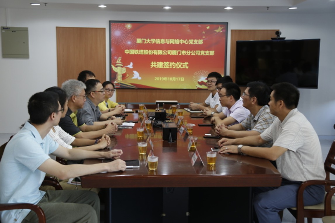 为深入学习贯彻习近平新时代中国特色社会主义思想和党的十九大精神,加强基层党组织建设,推动支部联建共建协作,开展多渠道、多层次、多形式的交流,结合“不忘初心、牢记使命”主题教育的开展,10月17日上午,厦门大学信息与网络中心党支部与中国铁塔股份有限公司厦门市分公司党支部结对共建签约仪式在厦门大学嘉庚主楼12楼会议室举行。