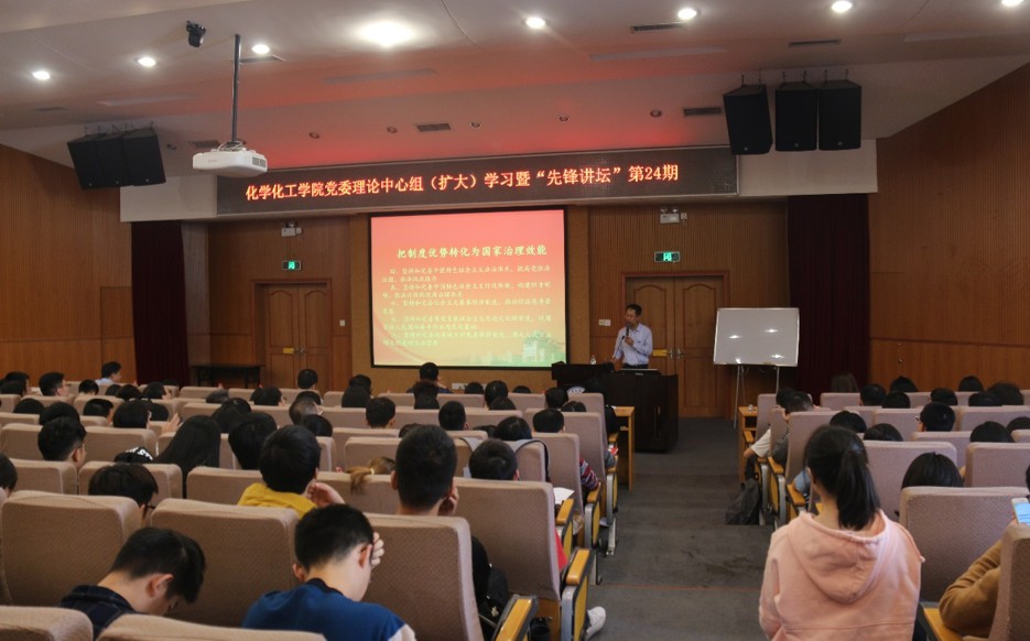 11月15日下午,为深入学习贯彻十九届四中全会精神,化学化工学院认真开展“不忘初心、牢记使命”主题教育,举办学院党委理论中心组(扩大)学习暨“先锋讲坛”第24期讲座,邀请了马克思主义学院张艳涛教授为我院师生作题为“把制度优势转化为国家治理效能——十九届四中全会精神解读”专题辅导报告。学院党委理论中心组、党政领导、师生党支部书记、党员300多人参加。报告由学院党委副书记李芬芬主持。