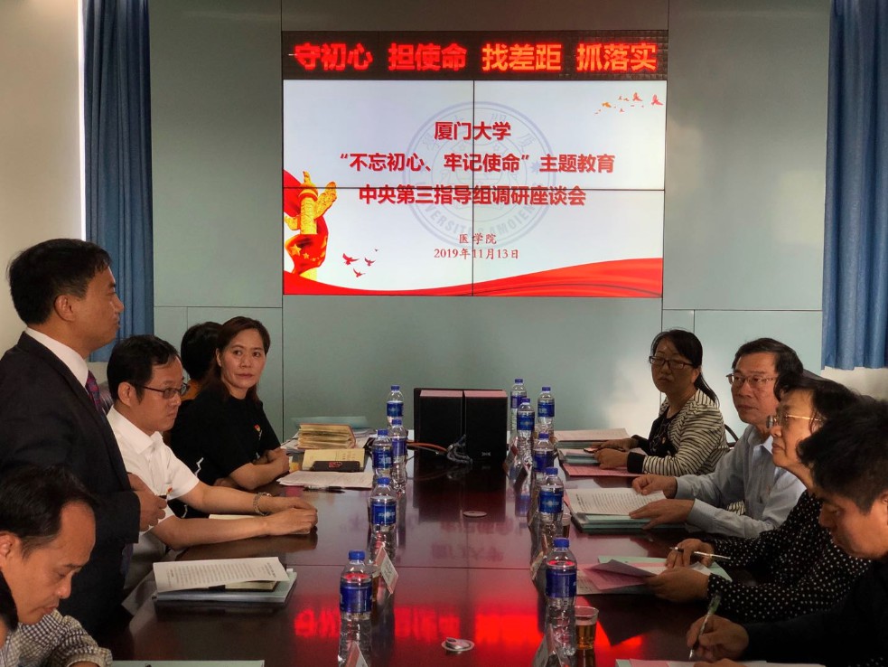 11月13日上午,中央第三指导组组长诸葛彩华、成员宋翔一行莅临医学院调研“不忘初心、牢记使命”主题教育开展情况。校党委副书记、副校长李建发,校党委常委、组织部部长、统战部部长孙理,校长助理、翔安校区党工委书记、管委会主任陈光陪同调研。