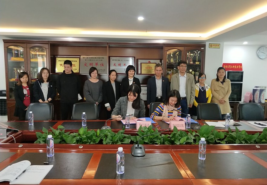 鹭江街道机关党支部书记汪黎晖与思政教工党支部支委王奇琦签订共建协议。
