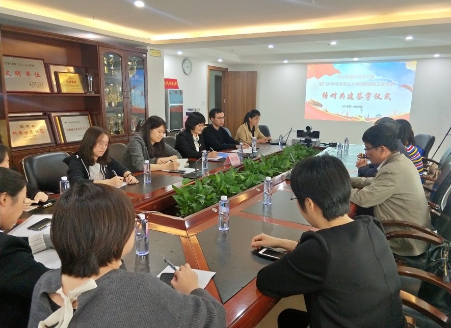 2019年11月29日下午,由马克思主义学院党委书记侯利标带队,思政教工支部徐雅芬、曾炜琴、章舜钦、王圣宠、王奇琦等一行六人前往厦门市思明区鹭江街道办开展支部共建活动。中共厦门市思明区鹭江街道办副主任齐秀秀、街道办机关党支部书记汪丽晖、王晶、黄小颂等人出席了本次活动。