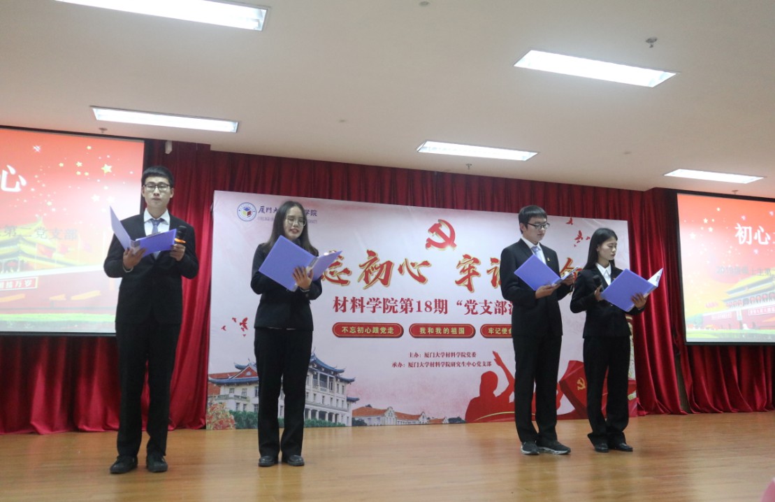 本次沙龙以“不忘初心、牢记使命”为主题,分三个篇章举行。正值澳门回归祖国20周年之际,材料学院办公室党支部全体成员首先带来经典歌曲《七子之歌》,展现了“一国两制”在澳门的成功实践,揭开了沙龙的第一篇章“不忘初心跟党走”。2019级硕士生第二党支部朗诵《初心》,表达了青年一代听党话,跟党走,聚力复兴大业的众志成城之志。2018级、2019级博士党支部通过照片故事分享的方式回顾厦大校史上的耀眼明星,领会人物背后的厦大精神。本科生党支部以知识竞答的形式《你画我猜,听猜红歌》将全场气氛推向高潮。